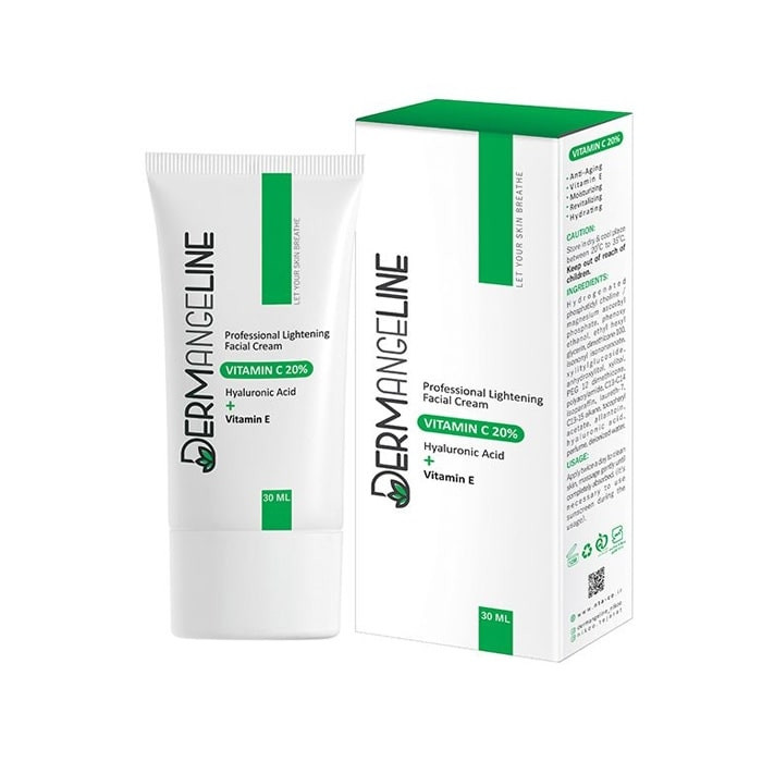کرم روشن کننده ویتامین سی 20% DERMANGELINE 30ml، آنتی اکسیدانی قوی حاوی 20 درصد ویتامین سی دارای خاصیت روشن کنندگی و برطرف کنندگی لک صورت میباشد و همچنین در شادابی و جوان سازی پوست صورت و گردن نیز تاثیر بسزایی دارد. همچنین موجب افزایش کلاژن سازی و جوان سازی پوست شده و از ایجاد لکههای تیره، پیری پوست و چروک صورت جلوگیری مینماید.