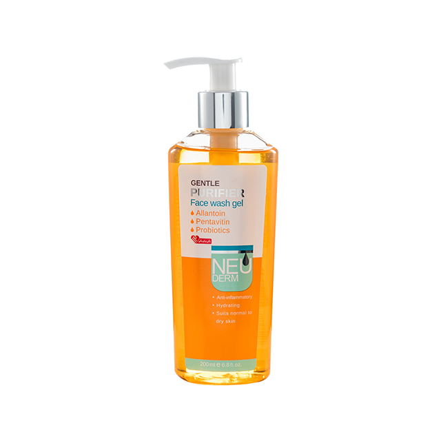 ژل شستشوی صورت جنتل پیوریفایر مناسب پوست نرمال و خشک NEUDERM، یک پاککننده قوی فاقد مواد صابونی میباشد