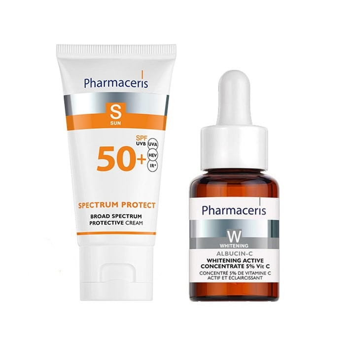 پکیج ضدآفتاب اسپکترام پروتکت Pharmaceris + کنسانتره روشن کننده آلبوسین سی Pharmaceris، شامل یک ضدآفتاب با محافظت بالا در برابر اشعههای خورشید و یک ضدلک با قابلیت از بین بردن لکهای سیاه یا قهوهای میباشد.