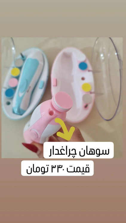 سوهان ناخن برقی نوزاد در دو رنگ صورتی و آبی و دارای 6 سر مجزا برای کارایی متفاوت با چراغ LED برای دقت بیشتر
