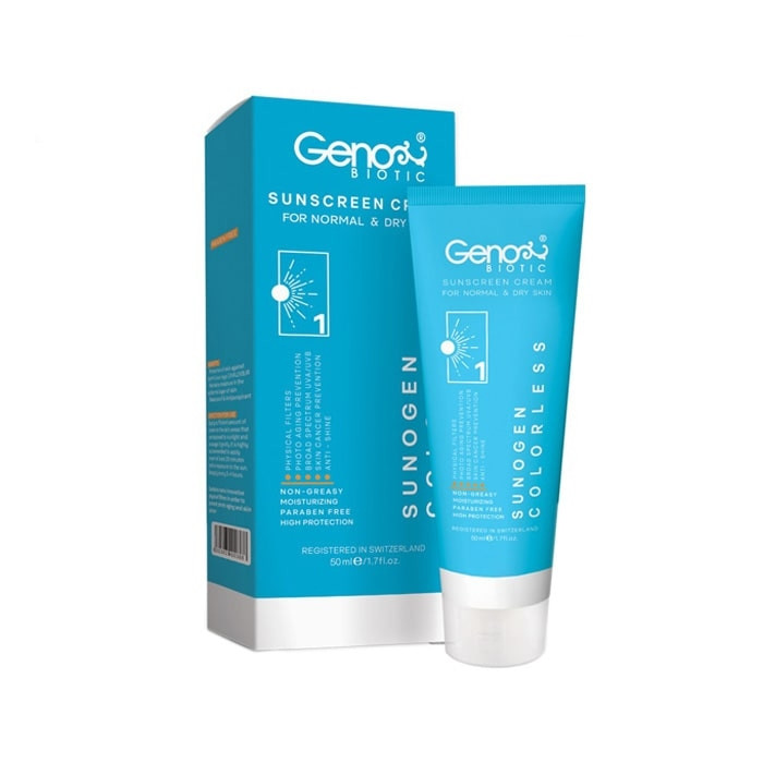 کرم ضد آفتاب مخصوص پوست نرمال و خشک بی رنگ Geno Biotic، مقاوم در برابر تعریق و آب بوده و از ایجاد چین و چروک جلوگیری میکند.